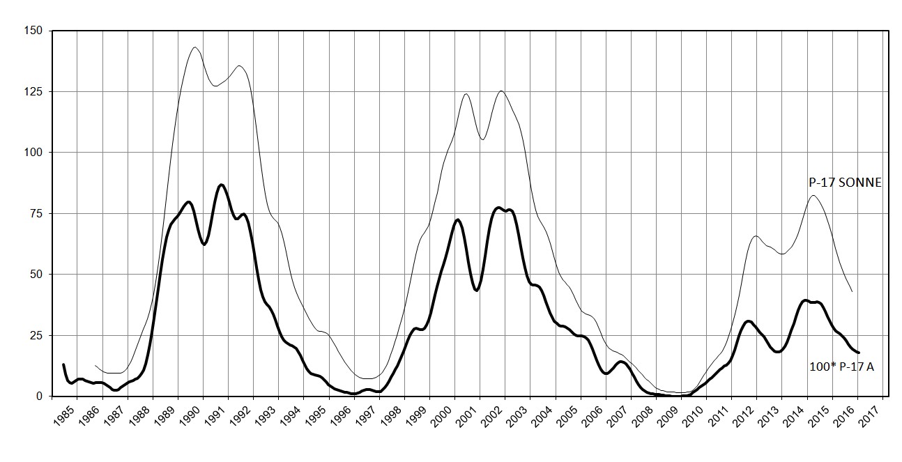 Die Darstellung der A-Zahlen (fette Linie) gegen die Relativzahlen des SONNE-Netz (dünne Linie), geglättet mit P17-Mittelung zeigt bemerkenswerte Einzelheiten. Zur besseren Darstellung sind die A-Zahlen mit zehn multipliziert.