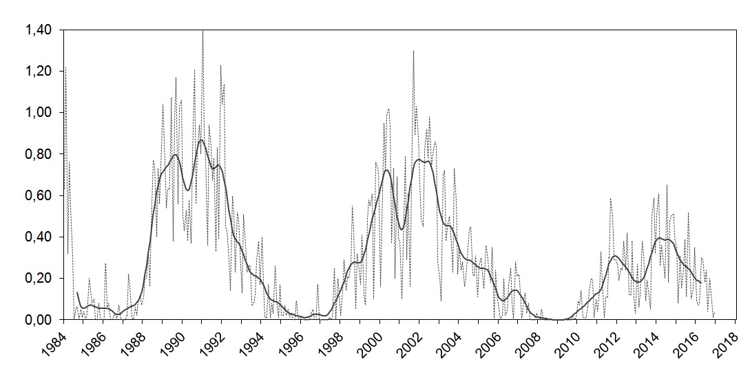 Die Graphik zeigt die Monatsmittel der A-Zahlen seit 1984, dem Beginn des Beobachtungsprojekts, bis 2016. Die geglättete Kurve entsteht durch P17-Mittelung. Die Monatsmittel sind ähnlich "verrauscht" wie die Wolf'schen Relativzahlen. Wir sehen im A-Netz also auch kurzfristige Schwankungen der Sonnenaktivität.