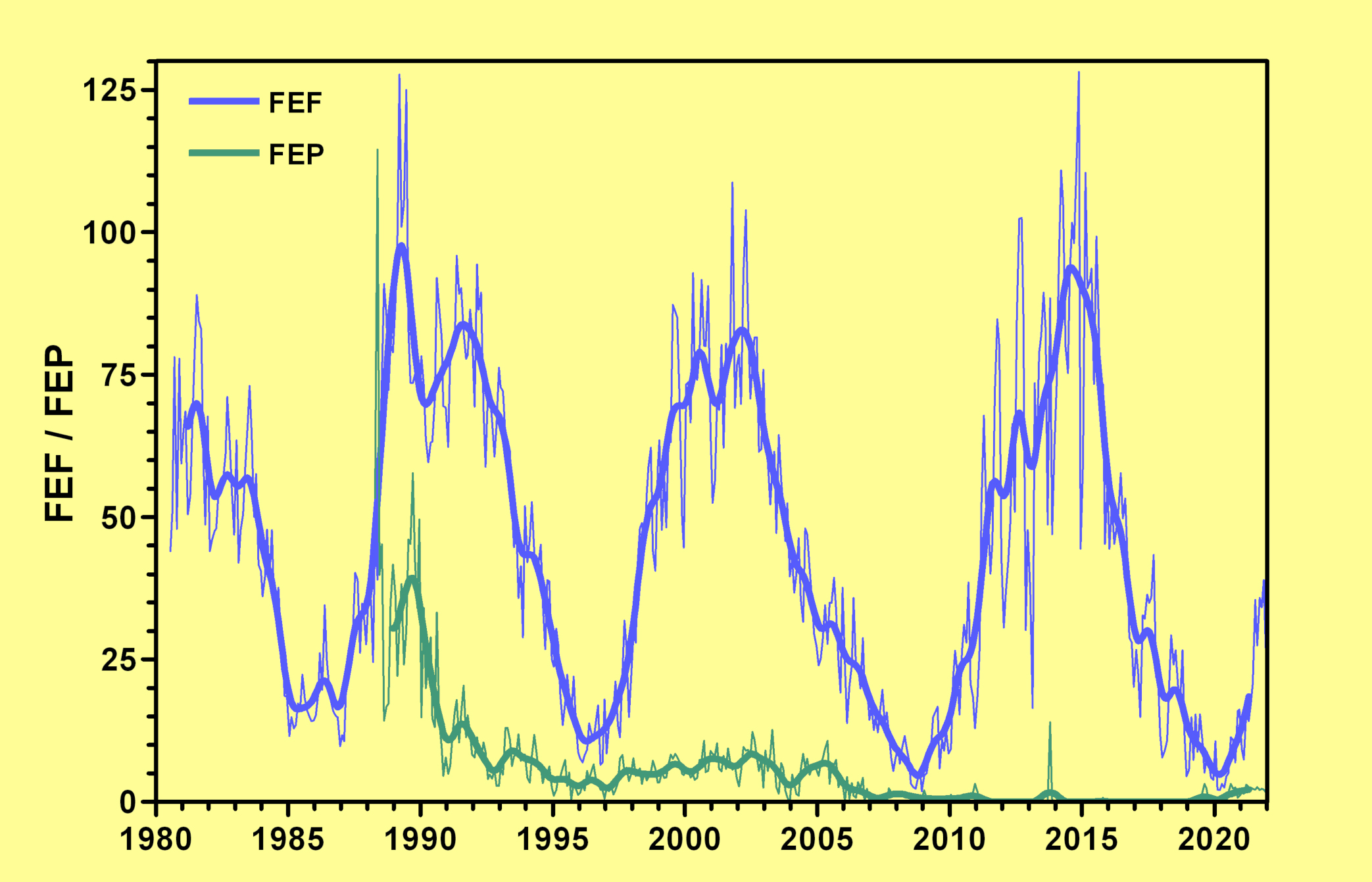 Monatsmittel der Anzahl der einzelnen flächenförmigen Fackeln (FEF) und punktförmigen Einzelfackeln (FEP) in der Hauptzone aus Beobachtungen des SONNE-Fackelnetzes. Der zyklische Verlauf der FEF ist deutlich, nicht jedoch bei den FEP. Die hohen FEP-Werte um 1990 herum entstanden in den Anfangsjahren der getrennten Zählung durch eine übertreibung. Besonders ein Beobachter sah und zählte wesentlich mehr FEP als andere. Später passte er seine Methode an.