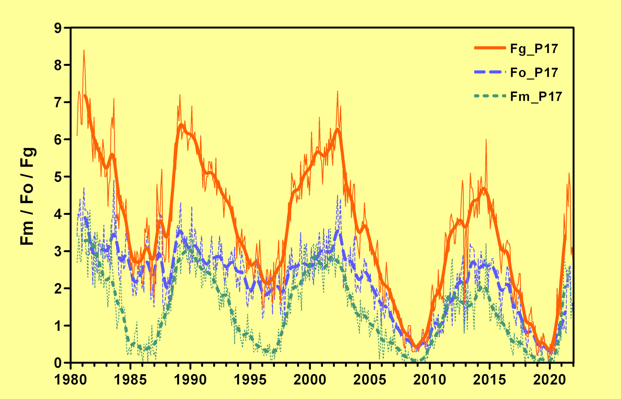 Die mittlere monatliche Anzahl der Fackelgebiete mit und ohne Flecken (Fm und Fo), sowie deren Gesamtzahl (Fg) aus Beobachtungen des SONNE-Fackelnetzes. Die durchgezogenen Linien zeigen den geglätteten Verlauf (P 17-Methode). Die Variation mit dem Zyklus der Sonnenaktivität ist sichtbar.