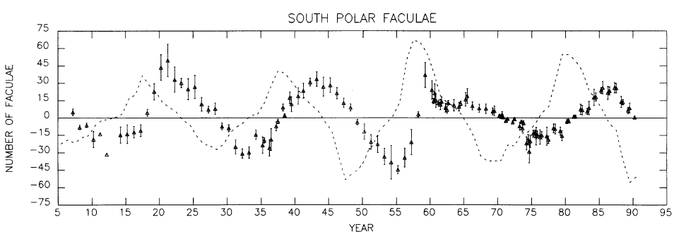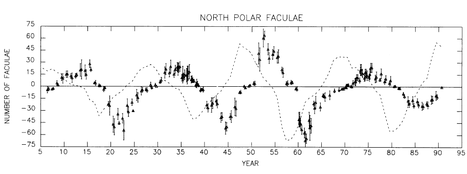 Die Graphik zeigt die Zahl der polaren Fackeln im Norden und Süden der Sonne von 1906 bis 1990.