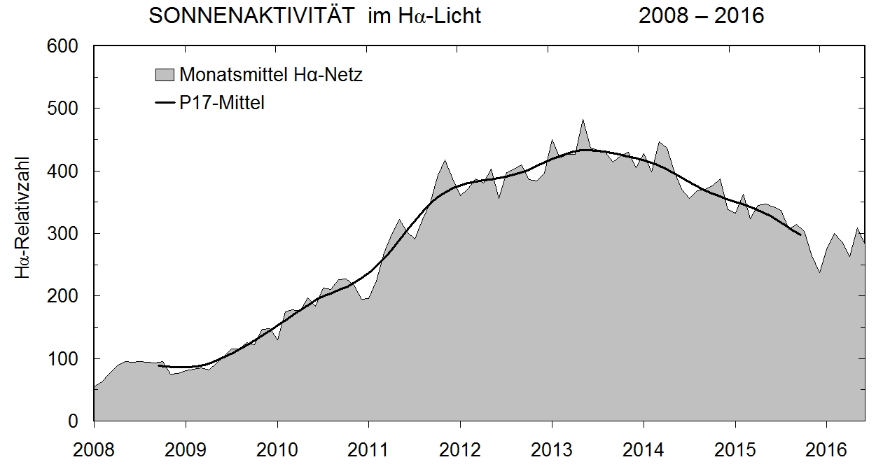 Das Bild zeigt die H-Alpha-Relativzahl seit 2008, aus Beobachtungen unseres "H-Alpha-Netz". Sie zeichnet den Verlauf des allgemeinen Zyklus der Sonnenaktivität nach.