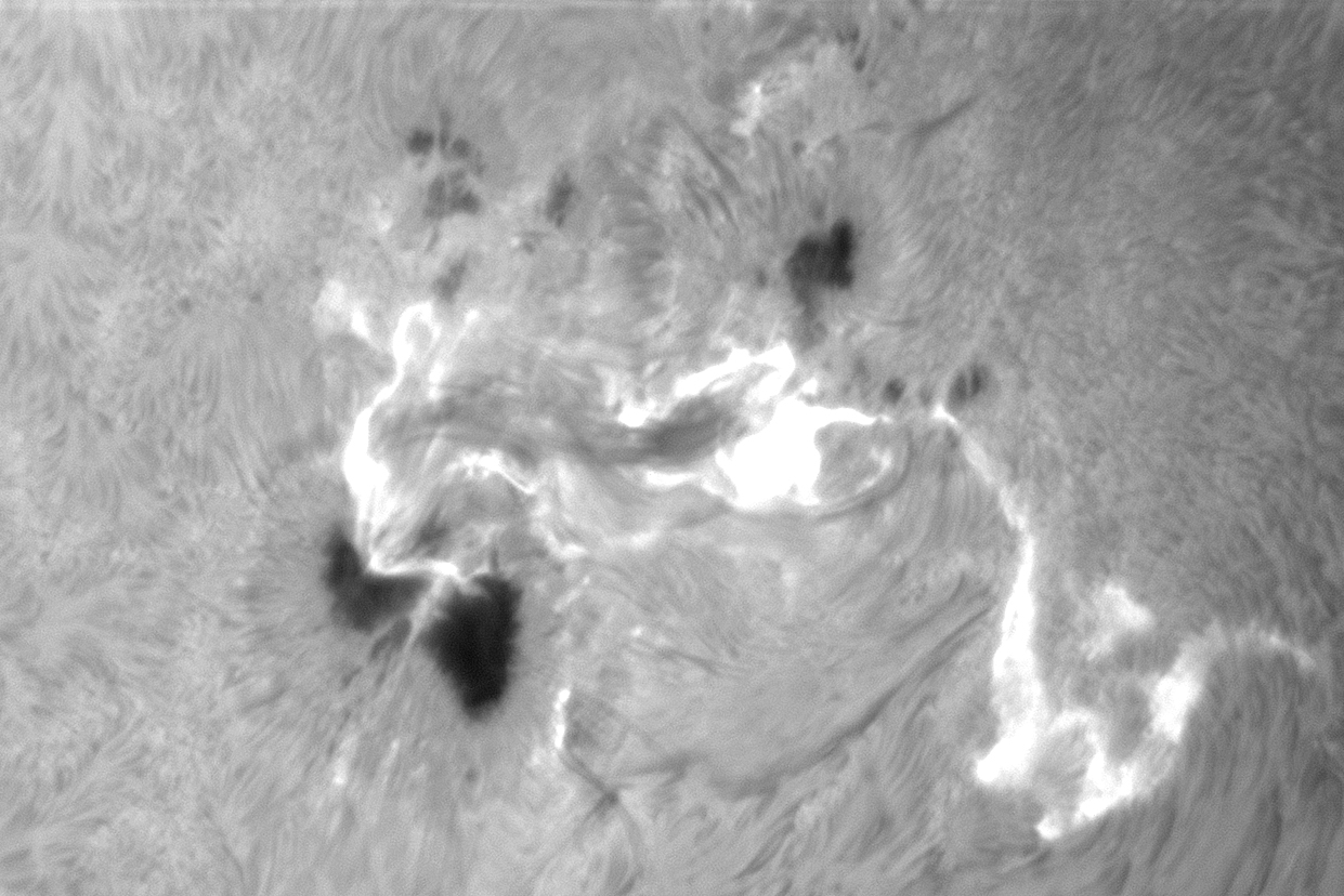 Das Bild von Dirk Lucius zeigt die typischen, sehr hellen "Flare-Bänder" im Bereich einer Sonnenfleckengruppe.
