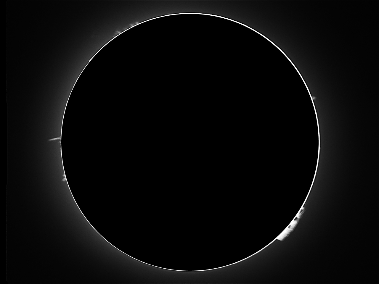 Protuberanzen sind am Sonnenrand als helle Erscheinungen erkennbar.