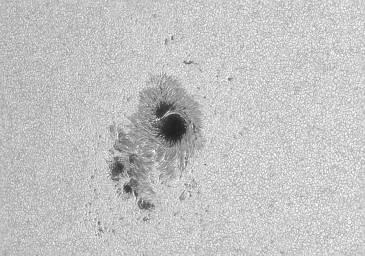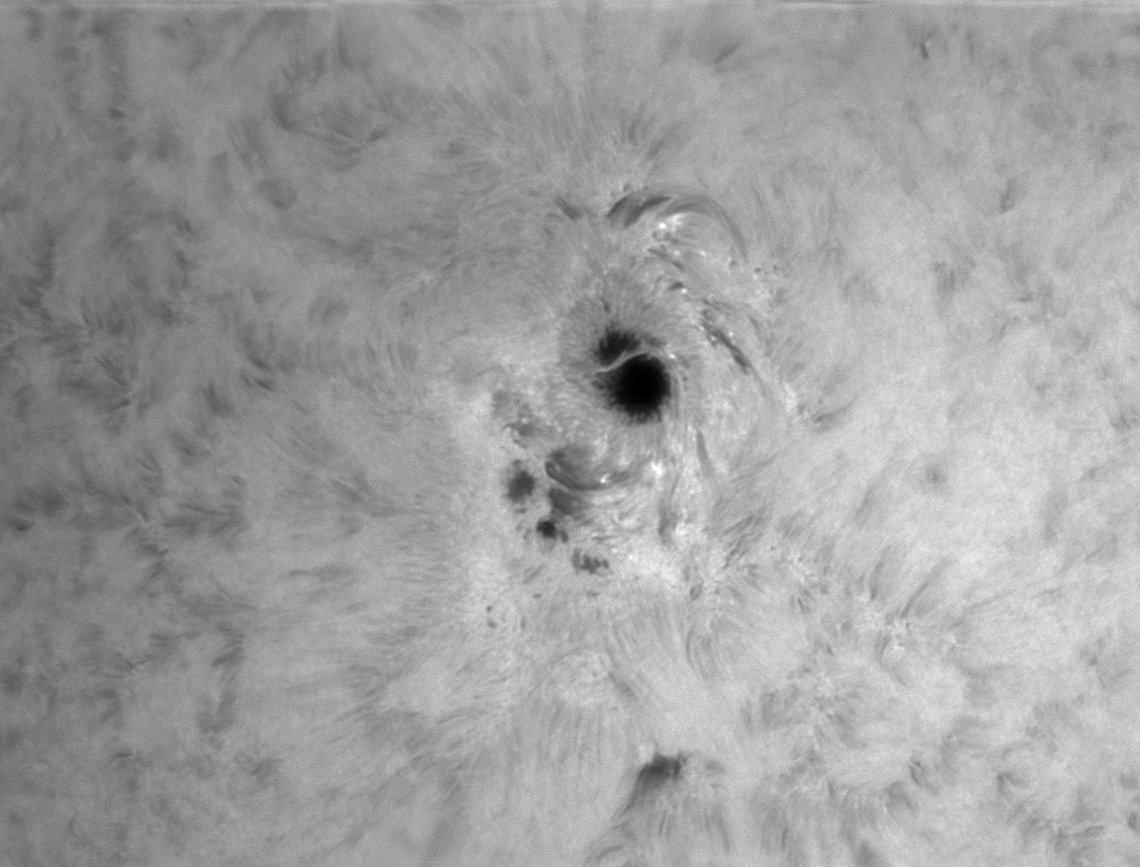 Die Bilder von Dirk Lucius zeigen einen Sonnenfleck, links im Weißlicht, rechts in H-Alpha. Das H-Alpha-Filter wurde etwas außerhalb des Linienzentrums eingestellt, wodurch auch Bewegungen des Gases in der Beobachtungsrichtung sichtbar werden, zum Beobachter zu oder weg. ("Doppler-Effekt").