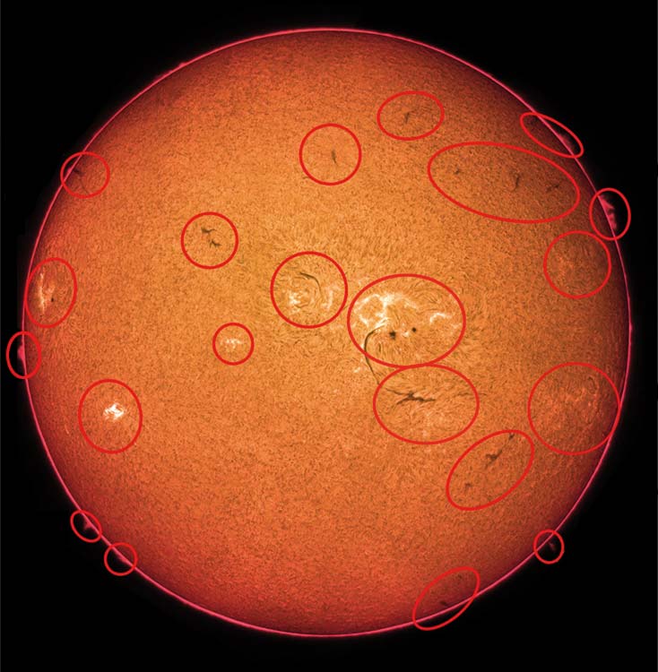 Das Bild oben zeigt, wie verschiedene "Herde" auf der Sonne aussehen und gezählt werden. Zur besseren Vergleichbarkeit mit der Weißlicht-Relativzahl wird die Anzahl der Aktivitätsherde abschließend mit dem Faktor 10 multipliziert.