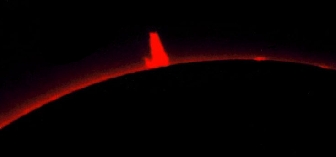 Das Bild oben zeigt eine Protuberanz, beobachtet mit einem Protuberanzenansatz. Die Sonnenscheibe ist mit einer Kegelblende abgedeckt und ist deshalb schwarz.