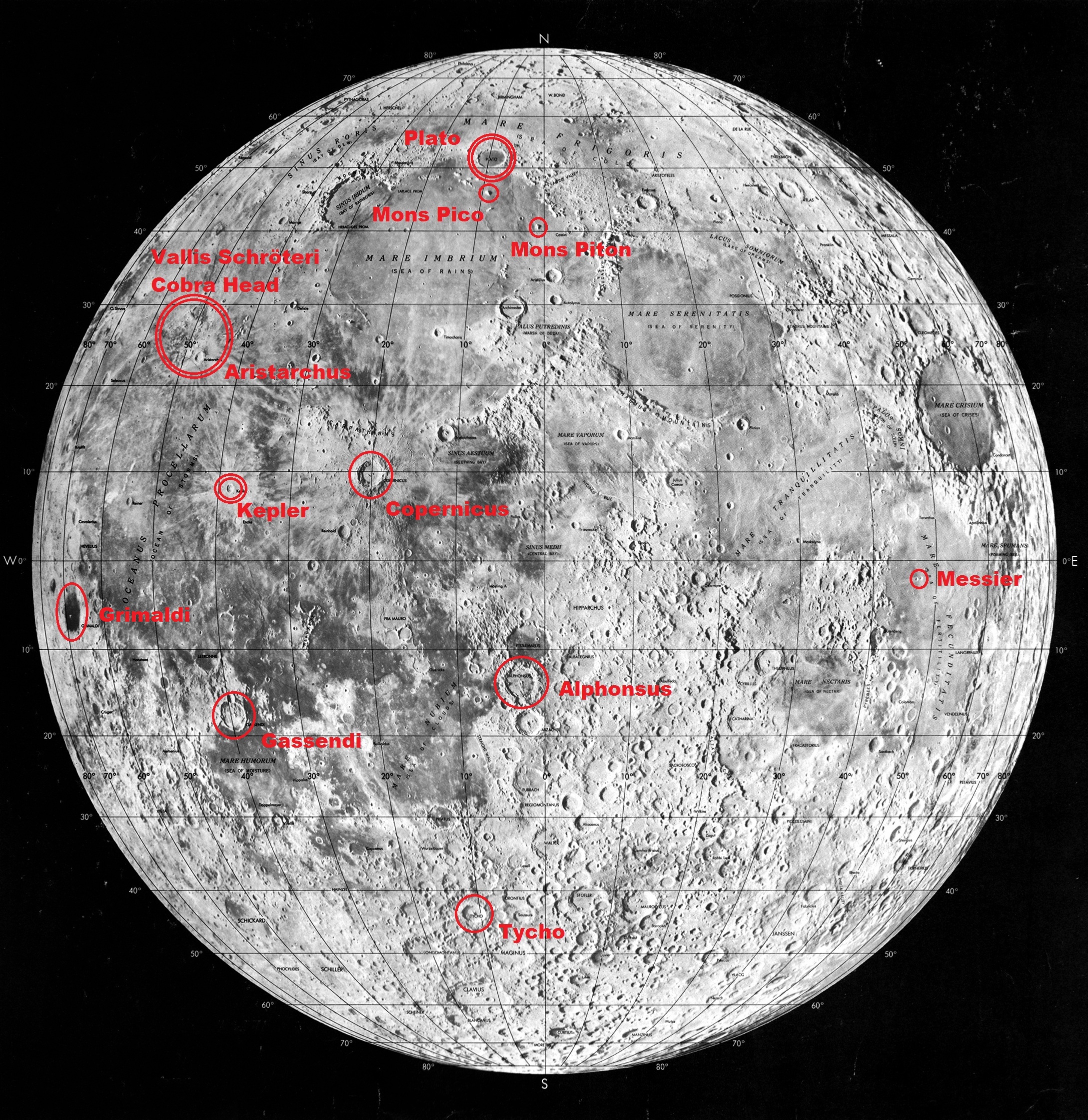 LTP werden an ganz bestimmten Orten auf dem Mond beobachtet. Die Mondkarte zeigt diese Gebiete. Doppelt eingekreist sind die Gebiete mit den häufigsten LTP, andere sind eher vernachlässigbar.