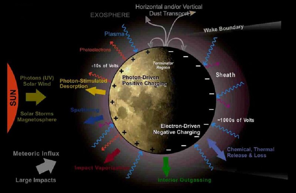 Das Bild zeigt die verschiedenen Wechselwirkungen des Mondes mit den Einflüssen aus dem Weltraum. Die elektrischen Spannungen sind durch Messungen nachgewiesen.