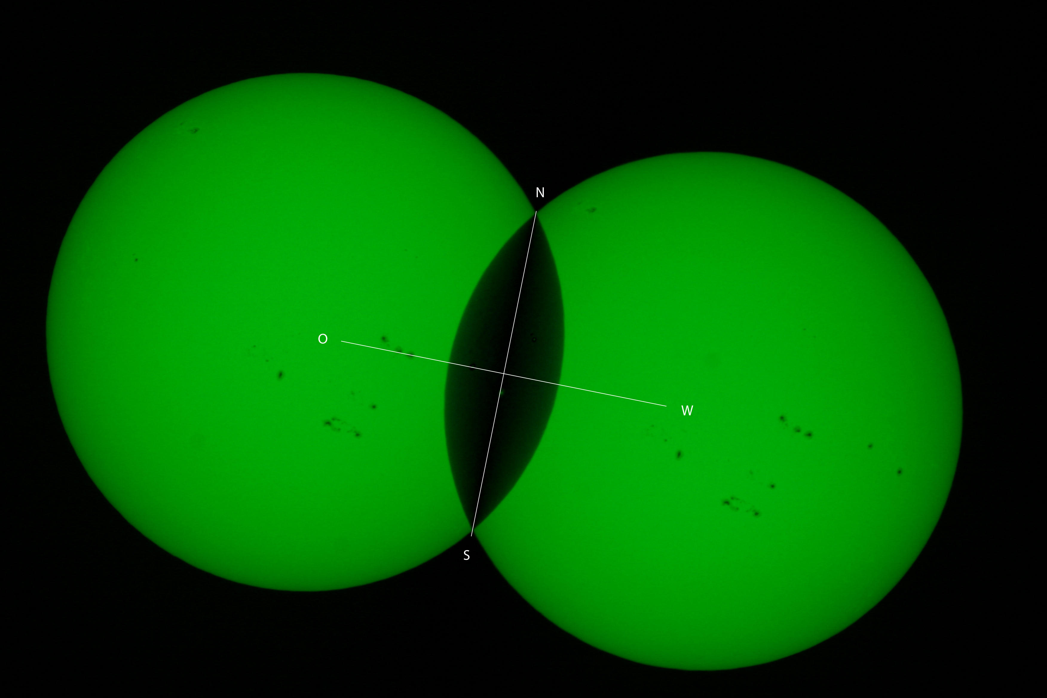 Das überlagerte Bild zeigt, wie aus beiden Aufnahmen die Ost-West-Richtung und damit auch die Nord-Süd-Richtung abgeleitet wird. Die Überlagerung und die Messungen erledigt eine Software.
