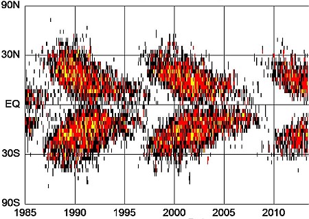 Über einen Sonnenfleckenzyklus hinweg, macht die Zone der Sonnenfleckenaktivität also eine Breitenwanderung, die sich über die Jahre hinweg verfolgen lässt.